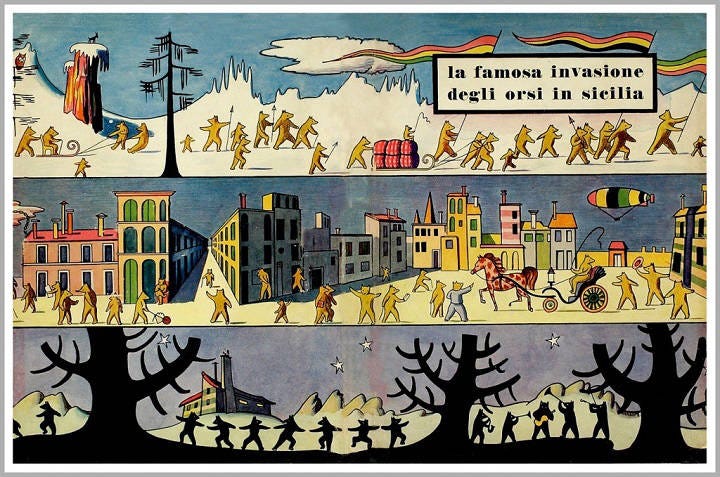 Le sue prime opere – Bàrnabo delle montagne (1933), Il segreto del bosco vecchio (1935), La famosa invasione degli orsi in Sicilia (1945) – hanno un sottofondo fiabesco e pochi riferimenti temporali precisi: ci troviamo in un immaginario eterno e universale che, però, pur nella trasfigurazione fantastica, riesce a parlare direttamente al nostro presente. Per esempio, sia Bàrnabo sia Il segreto del bosco pongono al centro la sacralità della Natura e la violenza del progresso che spinge gli esseri umani, incapaci di rispettare i propri limiti, a sopraffare e a depredare l’ambiente attorno. Anche ne La famosa invasione degli orsi ritorna il tema dell’avidità umana, che addirittura “contagia” anche un’altra specie, rendendo egoisti e ubriachi di potere degli apparentemente pacifici orsi di montagna.