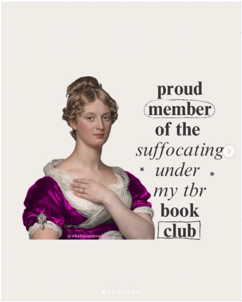 Torno a recuperare un po’ di lavoro arretrato (da brava millennial mi sento in colpa se mi assento per giorni) ma vi lascio con un meme di whatsjoanareading (come al solito, io penso, lei parla):